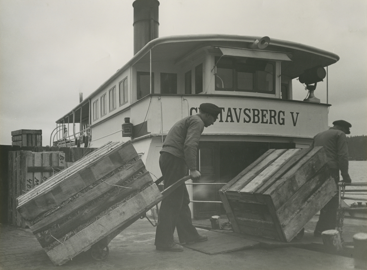 Lastning av lådor med porslin för transport med ångbåten Gustavsberg V.