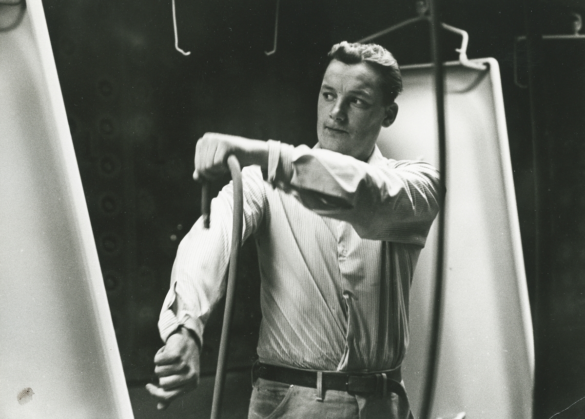 Interiör. Badkarsfabriken. Lyftning av badkar.