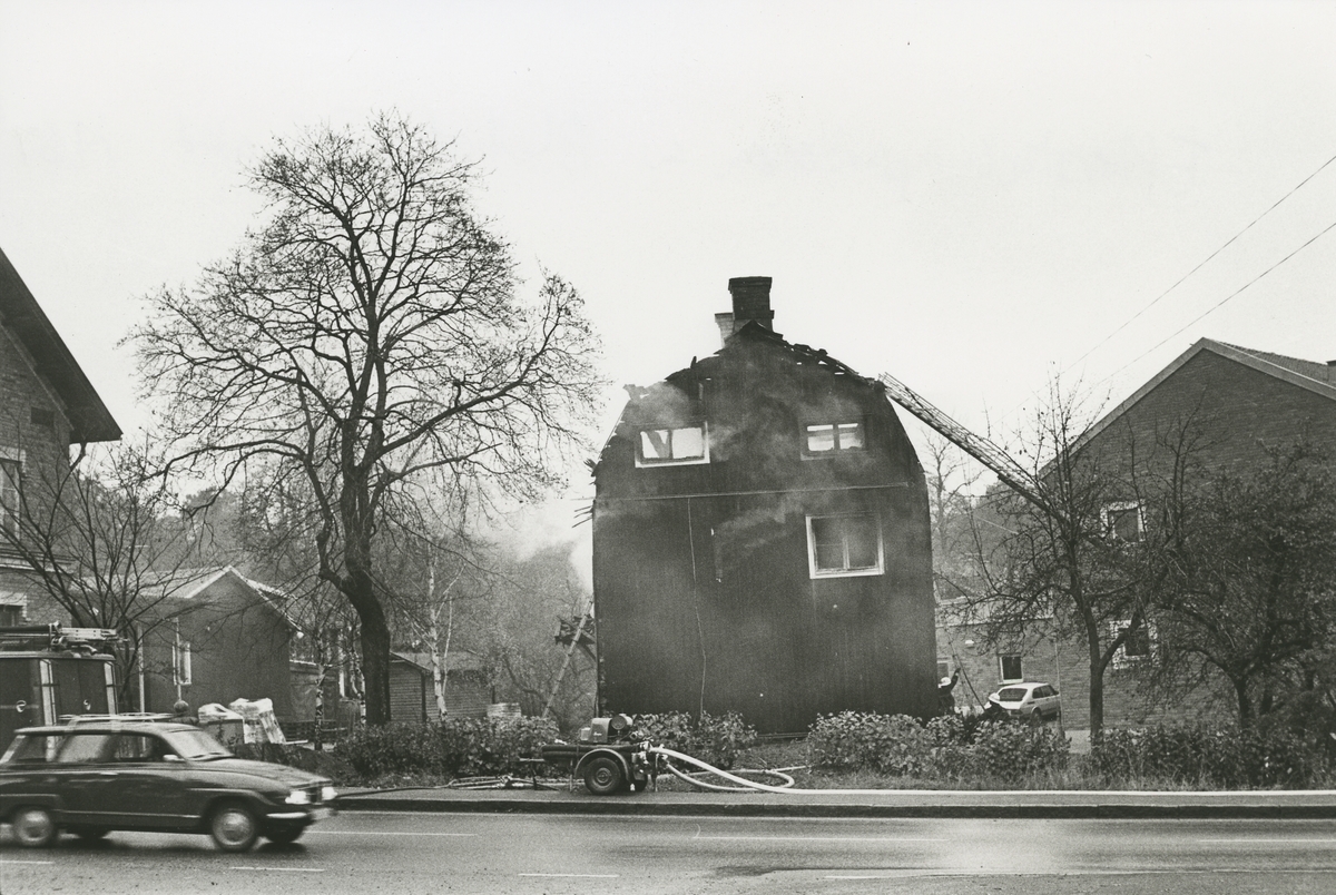 Exteriör. Bleket, Wärmdögatan. Eftersläckningsarbete efter brand,