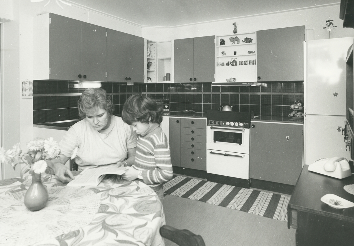 Interiör. Rymligt modernt kök. Sannolikt i ett av husen vid Mariagatan. Stilen är av allt att döma från 1960-talet.