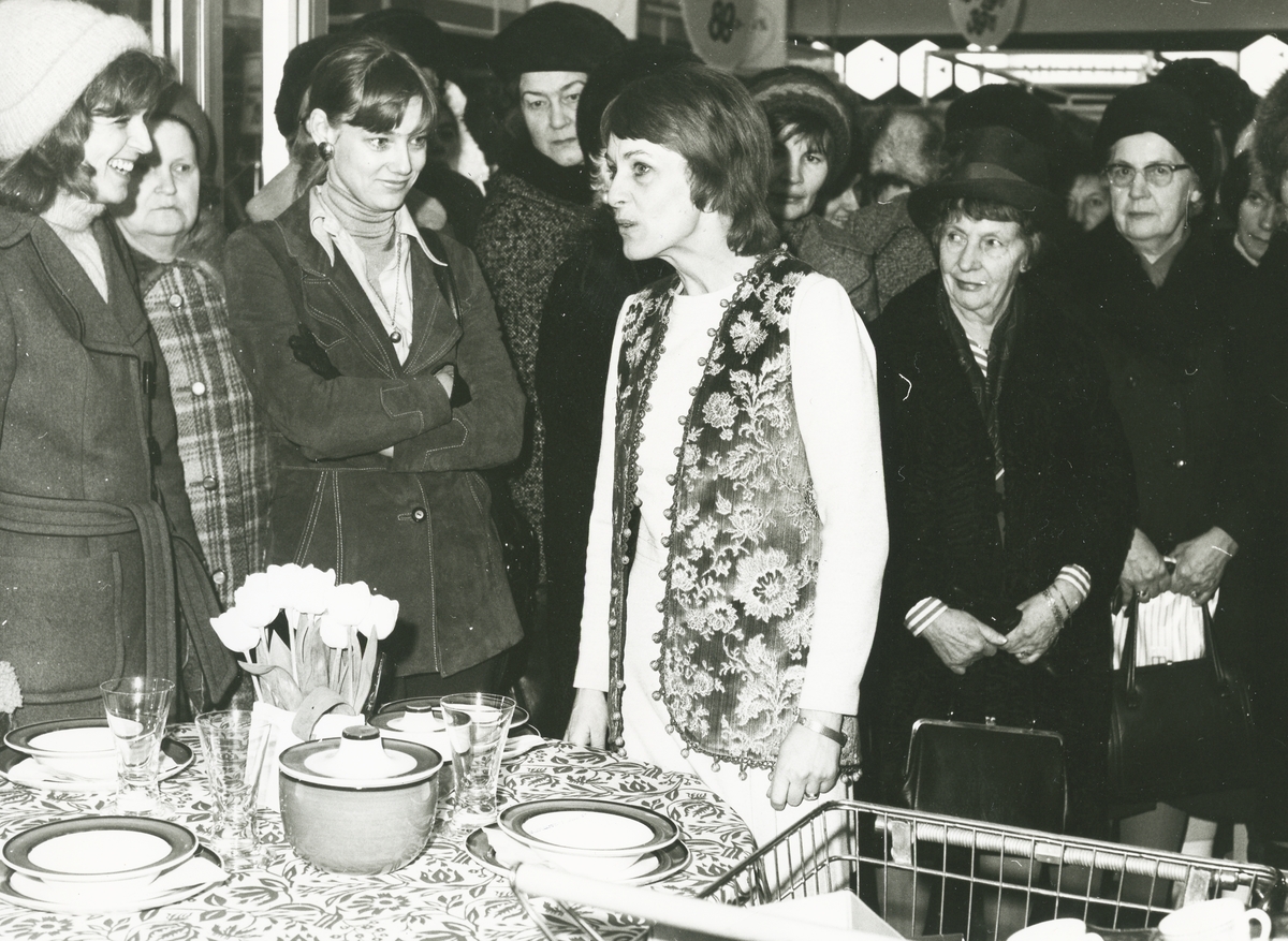 PUB Bohagshus. Utställning av hushållsporslin från Gustavsbergs Fabriker. Inbjuden gäst: Siw Malmkvist.