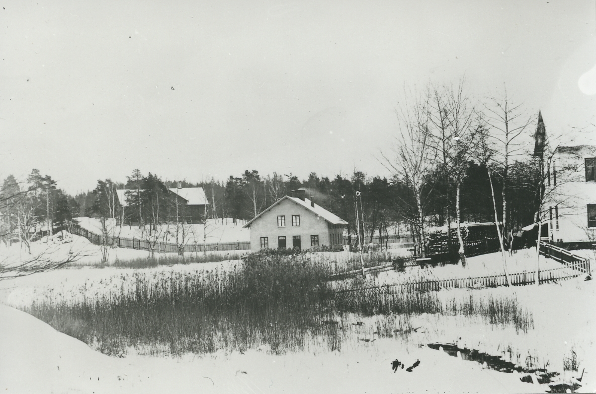 Exteriör. Tvättstugan vid Bagarns träsk, Gustavsberg. Riven i samband med byggnationen av Runda huset 1953 strax intill. T.v. Klubbhuset och t.h. Bageriet.