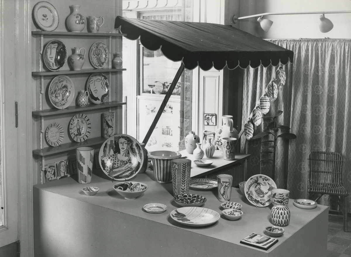 Interiörbild. Utställning med föremål från Gustavsbergs fabriker. Fat och vaser. Fajanser målade i rödlera, polykrom dekor. Konstnärer: Wilhelm Kåge och Stig Lindberg. 1942. Plats okänd.