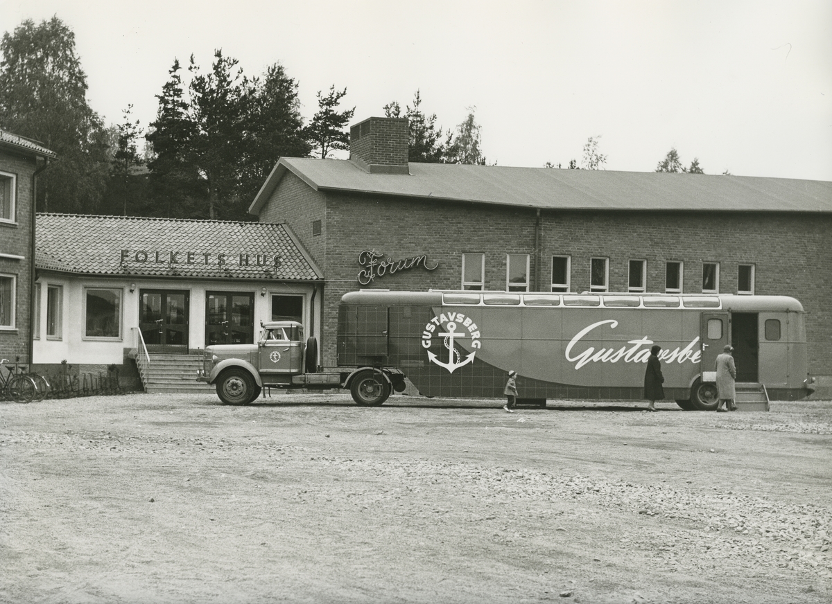 Exteriör. Gustavsbergsbussen parkerad utanför Folkets Hus i Ljungaverk.