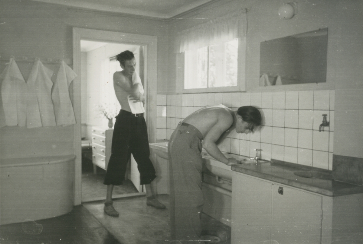Interiör, tvättrum. Sannolikt från ett bostadshotell (okänt) för unga män.