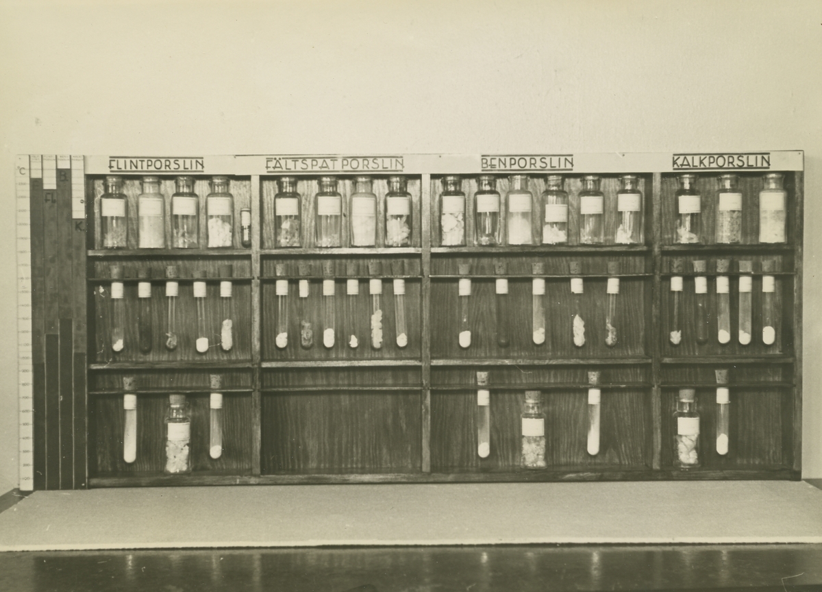 Interiör, Materiallaboratoriet. Förvaring av glasyrråvaror för testbruk.