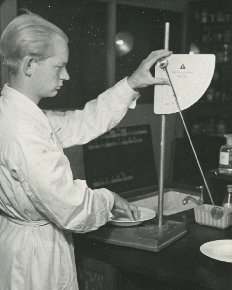 Interiör, Materiallaboratoriet. Provning av kanthållfastheten hos en tallrik benporslin med en s k pendelhammare.