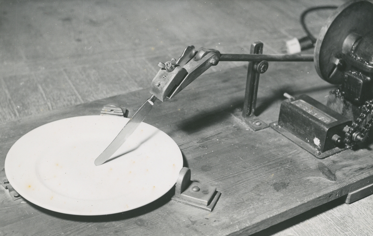 Interiör, Materiallaboratoriet. Utförande av skraptest på tallrik.