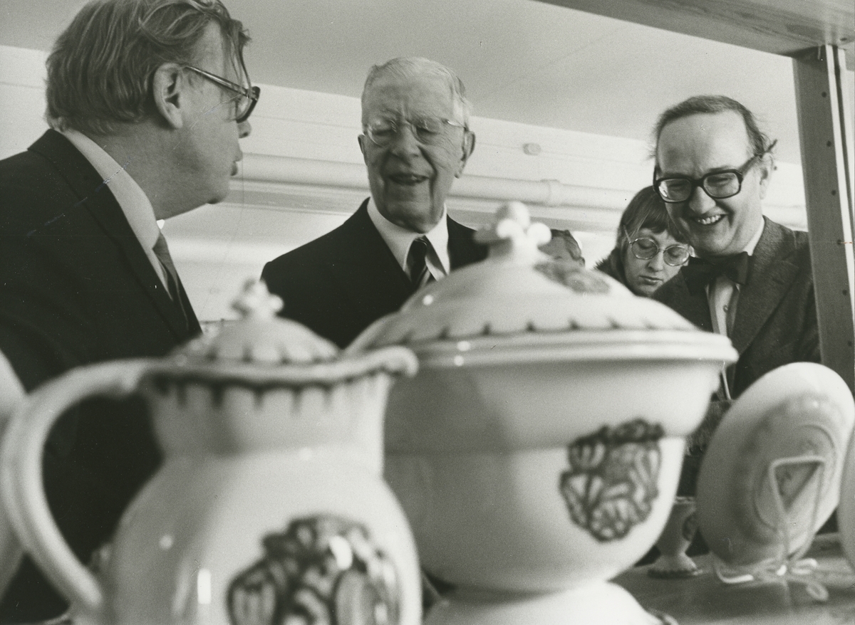 Kungligt besök på Gustavsbergs porslinsfabrik. Sannolikt Porslinsmuseet i Gula byggningen, tidigare benämnt Gamla kontoret.
