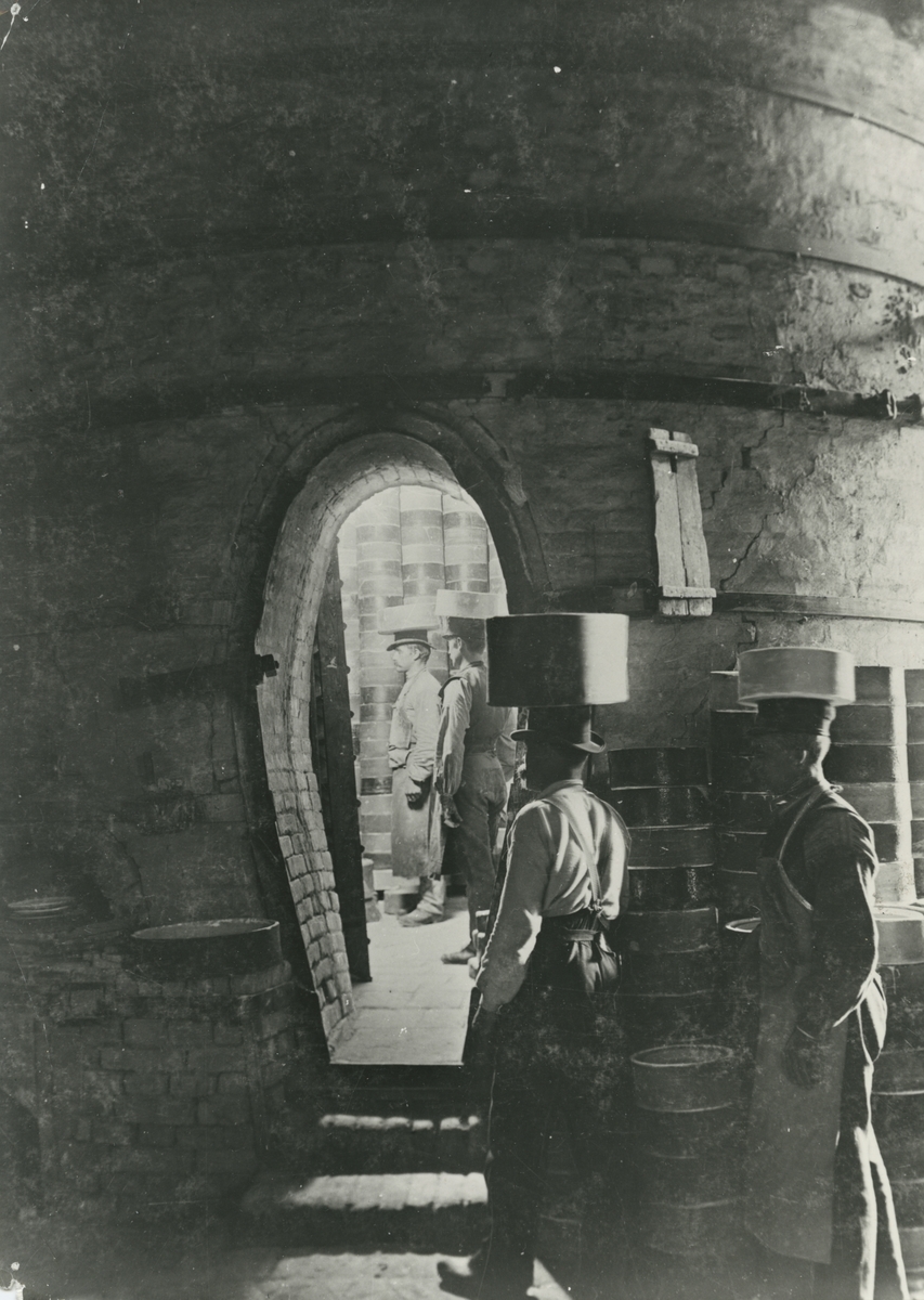 Sättning av kapslar, s k kokor, i koleldad rundugn. De är fyllda med rågodsbränt, glaserat porslin som ska glasyrbrännas (Hald, 1991:34). Kokorna bars på ugnsarbetarnas specialpolstrade hattar och vegamössor. När ugnen fyllts igen murades ingången igen och bränningen inleddes (Arvidsson, 2007:66).