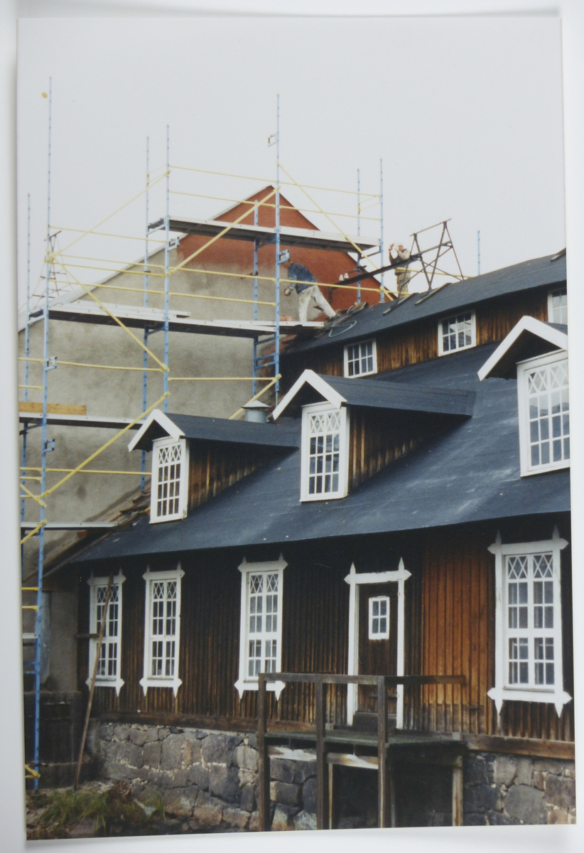 Mekaniska verkstadens fasad med byggställning och Smedjan i förgrunden.