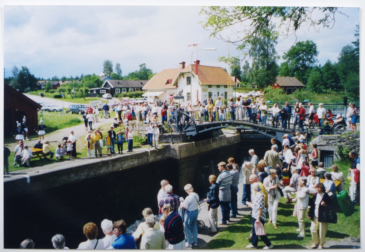 Besökare vid slussen och på gamla bron över Göta Kanal