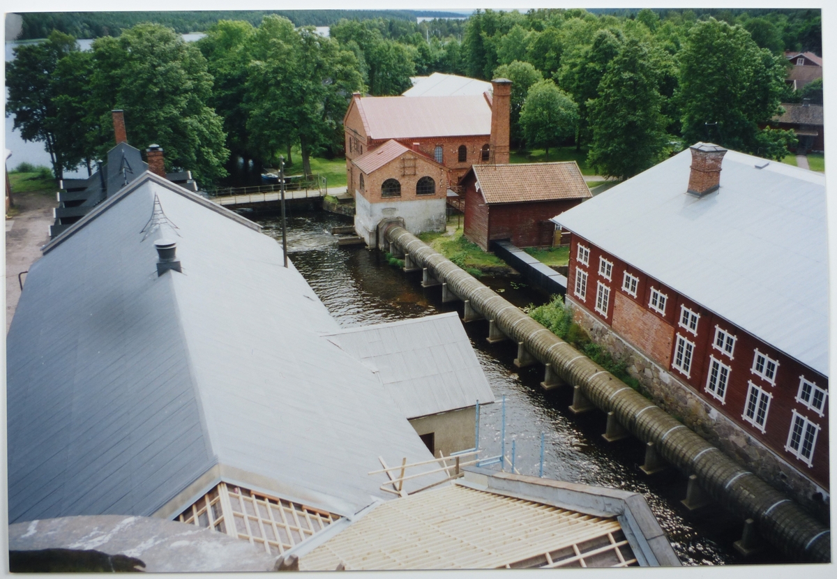 Vy från skylift vid pannrumsskorstenen mot nordväst - strömmen: Maskinverkstden, Mekaniska verkstaden, Träsliperiet, Kalorifären, Elektricitetshuset