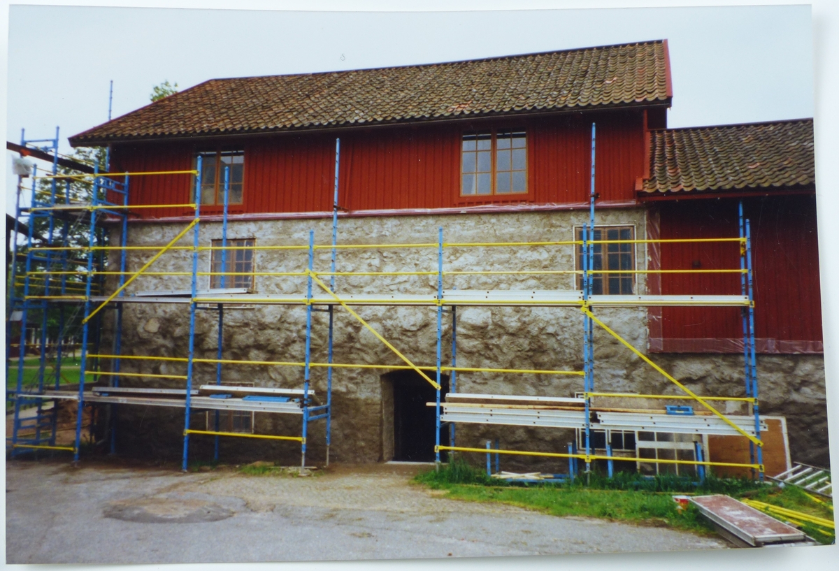 Restaureringsarbete på Kvarnen. Ny platsblandat puts av kalkbruk slogs sedan på.