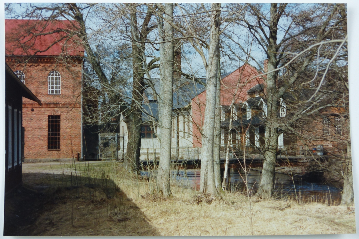 Modellförrådet och Elektricitetshuset till vänster om Strömmen. Metallgjuteriet, Smedjan och Mekaniska verkstaden till höger.