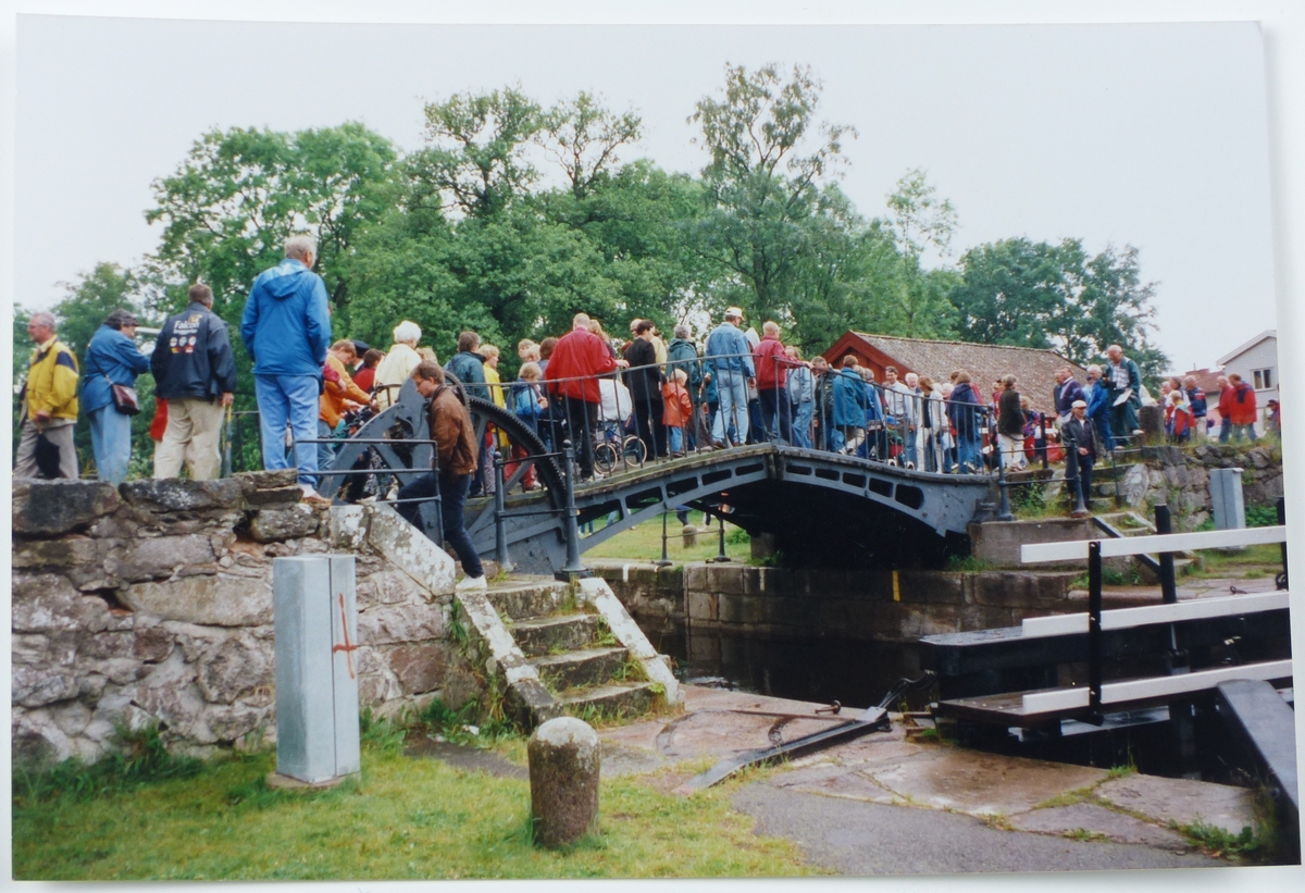 Folk går över gamla bron vid Forsviks sluss
