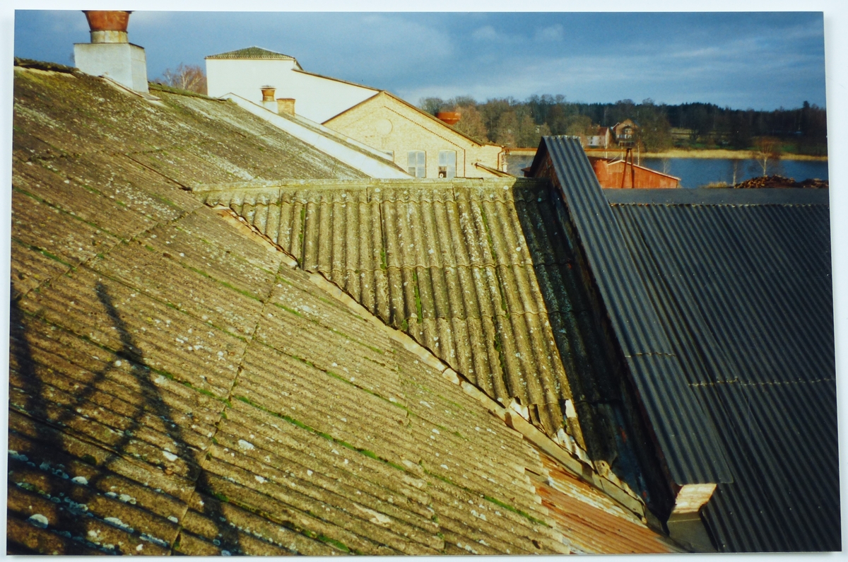 Takanslutning mellan Mekaniska verkstan och Maskinverkstad, eternit och sinuskorrugerad med grafitlinoljefärg ommålat plåttak
