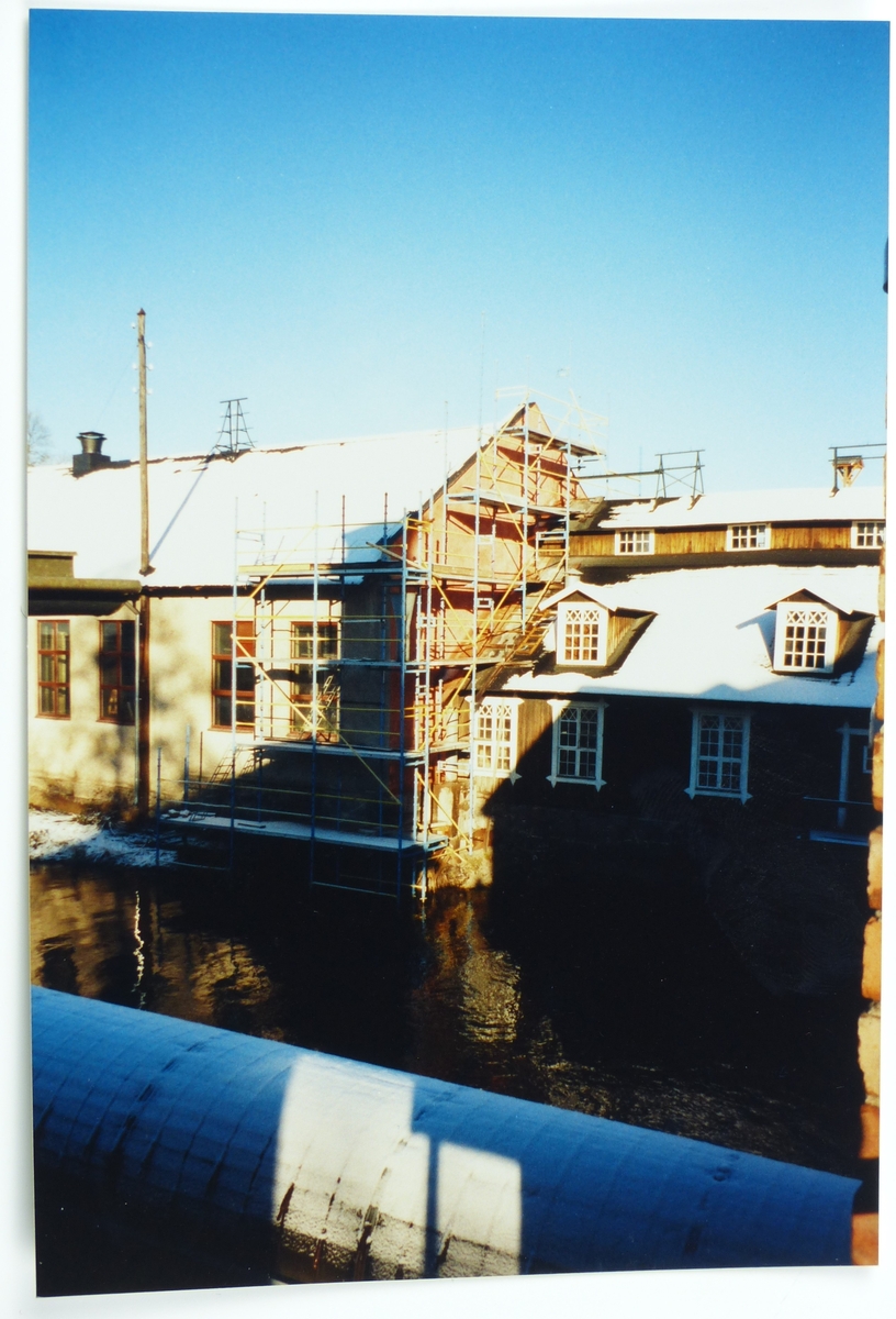 Byggställning på Mekaniska verkstadens gavel för putsarbeten