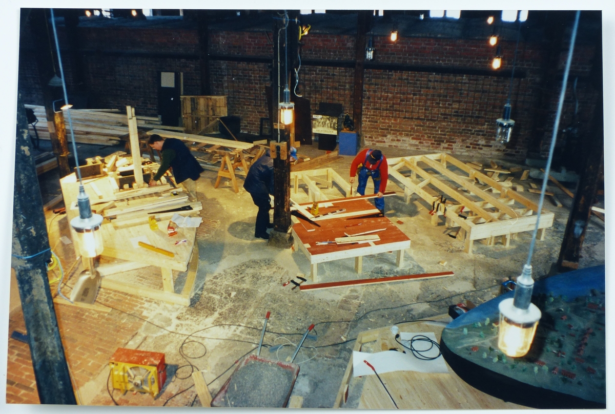 Träsliperiet, basutställning 1996, vy från receptionstaket över utställningspodier