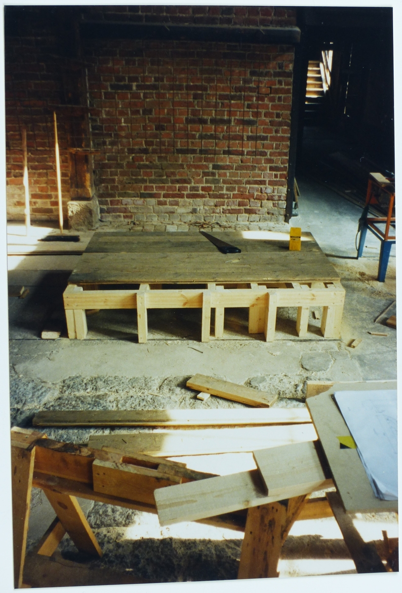 Pappersmassepodium, kraftig stomme för kvarnsten, äkta gammalt golv i Träsliperiet