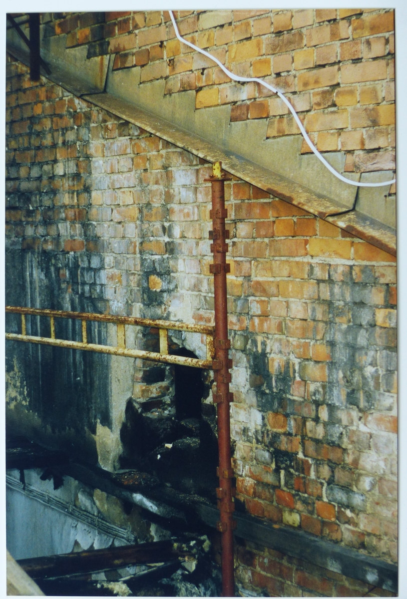 Gjuteriet, anslutningen av nedre takfallet mot kupolugnsutb., hål i murverket