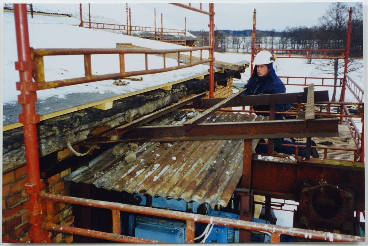 Gjuteriet, tak över transporthissen efter demontering av sinusplåt. Ny råspont på kupolugnstaket