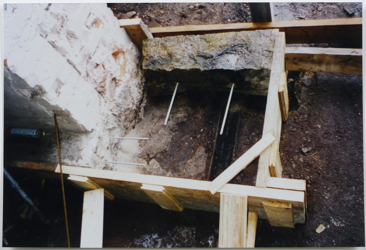 Gjuteriet, restaurering, östra gaveln, formsättning för betongfundament för murpelare