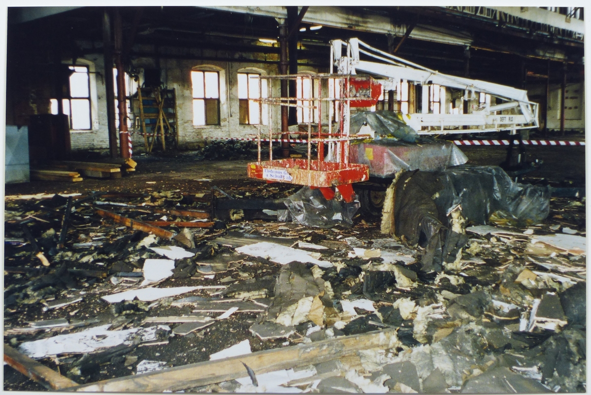 Gjuteriet, skylift används vid rivning av undertaket, rivningsmaterial på golvet