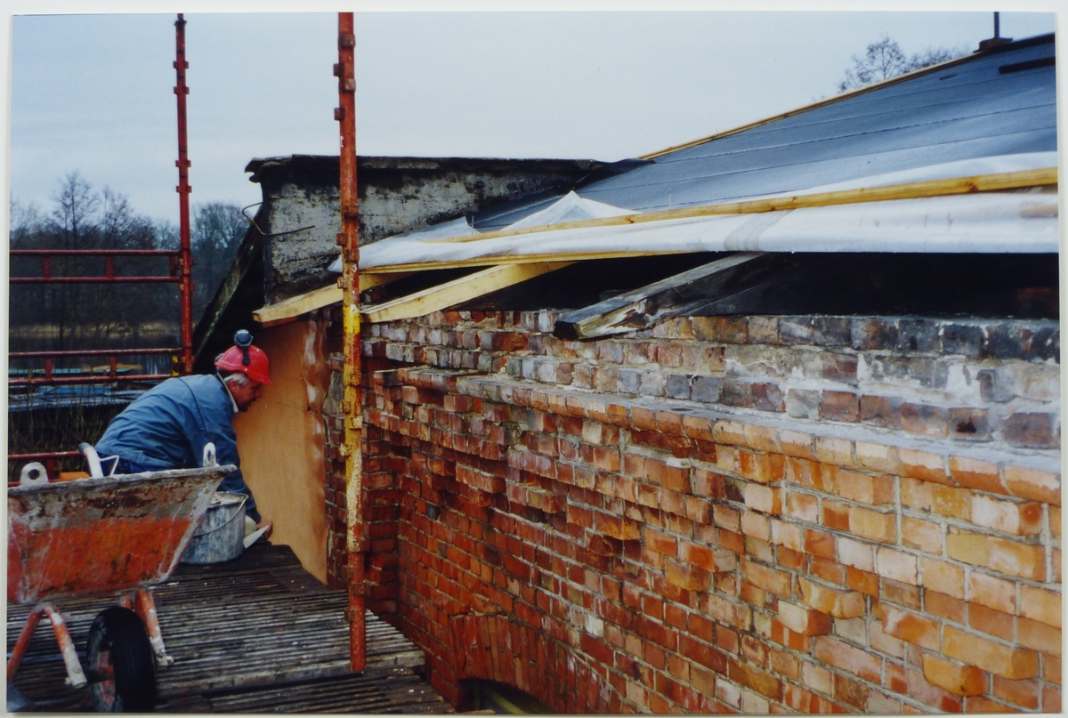 Gjuteriet, muraren Kjell Karlsson lagar sönderfrusen takfot