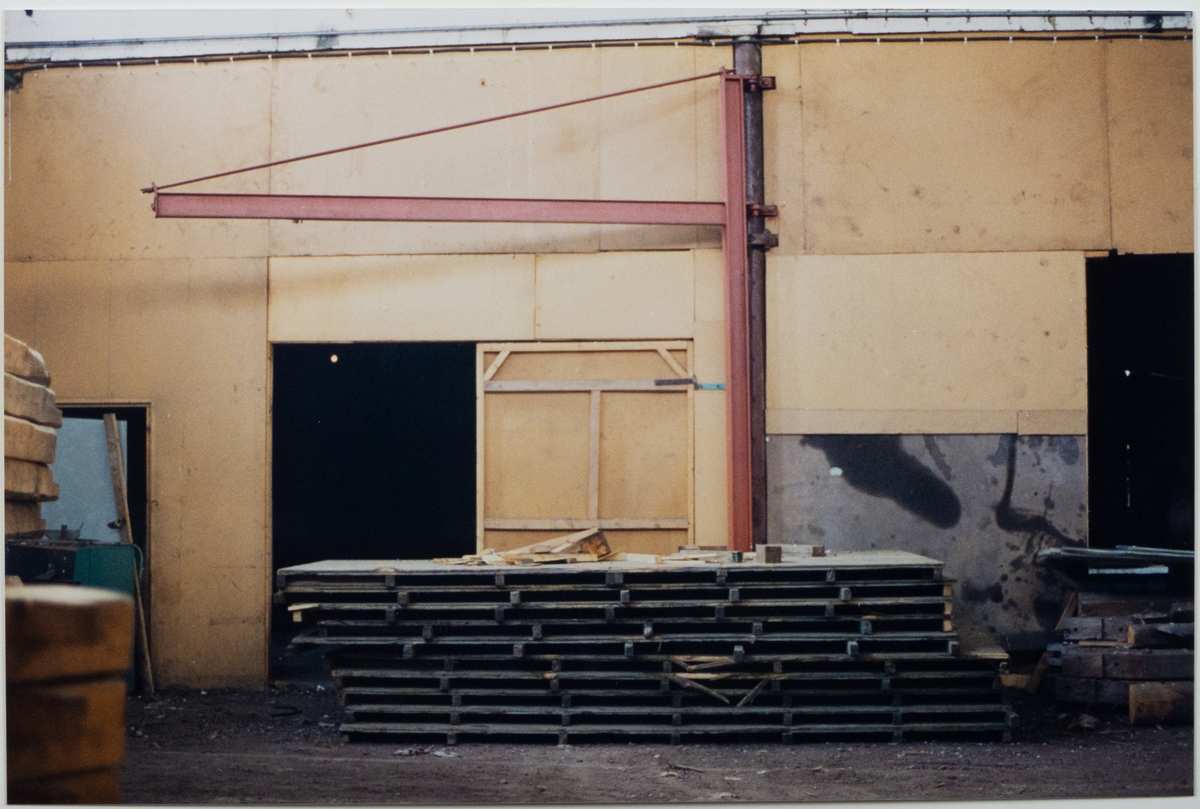 Gjuteriet, översiktsbild, interiör, tillfälligt materialupplag, taket fuktskadat på flera ställen