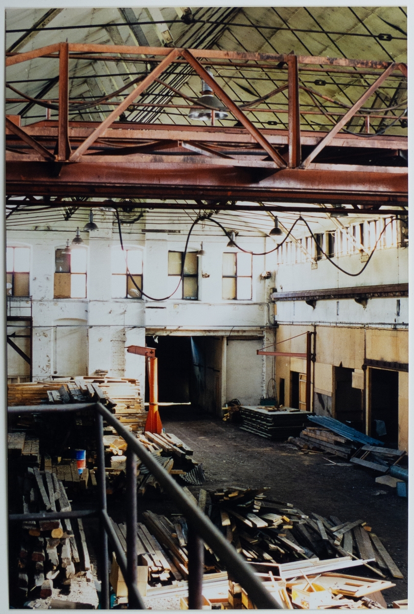 Titel: Gjuteriet, översiktsbild, interiör, tillfälligt materialupplag, taket fuktskadat på flera ställen