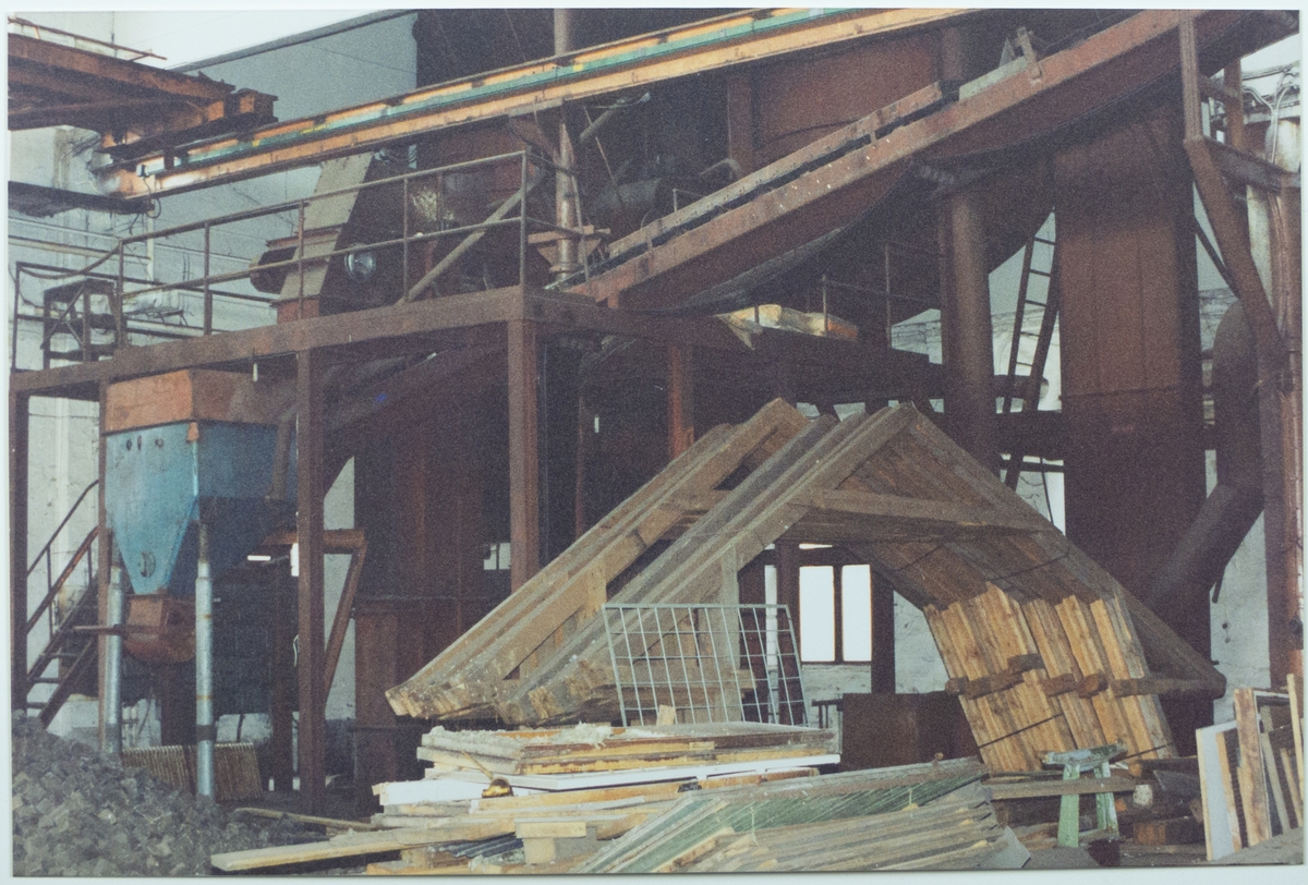 Gjuteriet, översiktsbild, interiör, tillfälligt materialupplag, taket fuktskadat på flera ställen