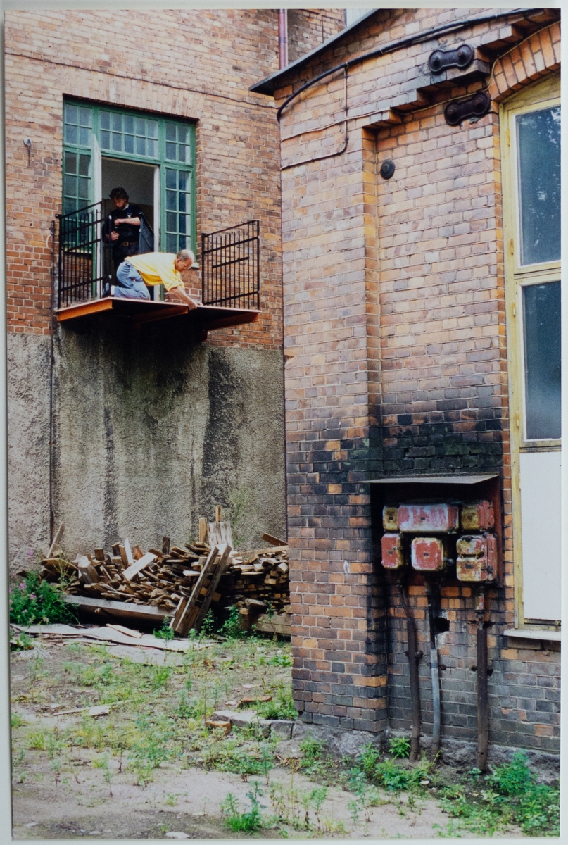 Per-Olof Olofsson monterar smidesräcket på Brukskontorets balkong