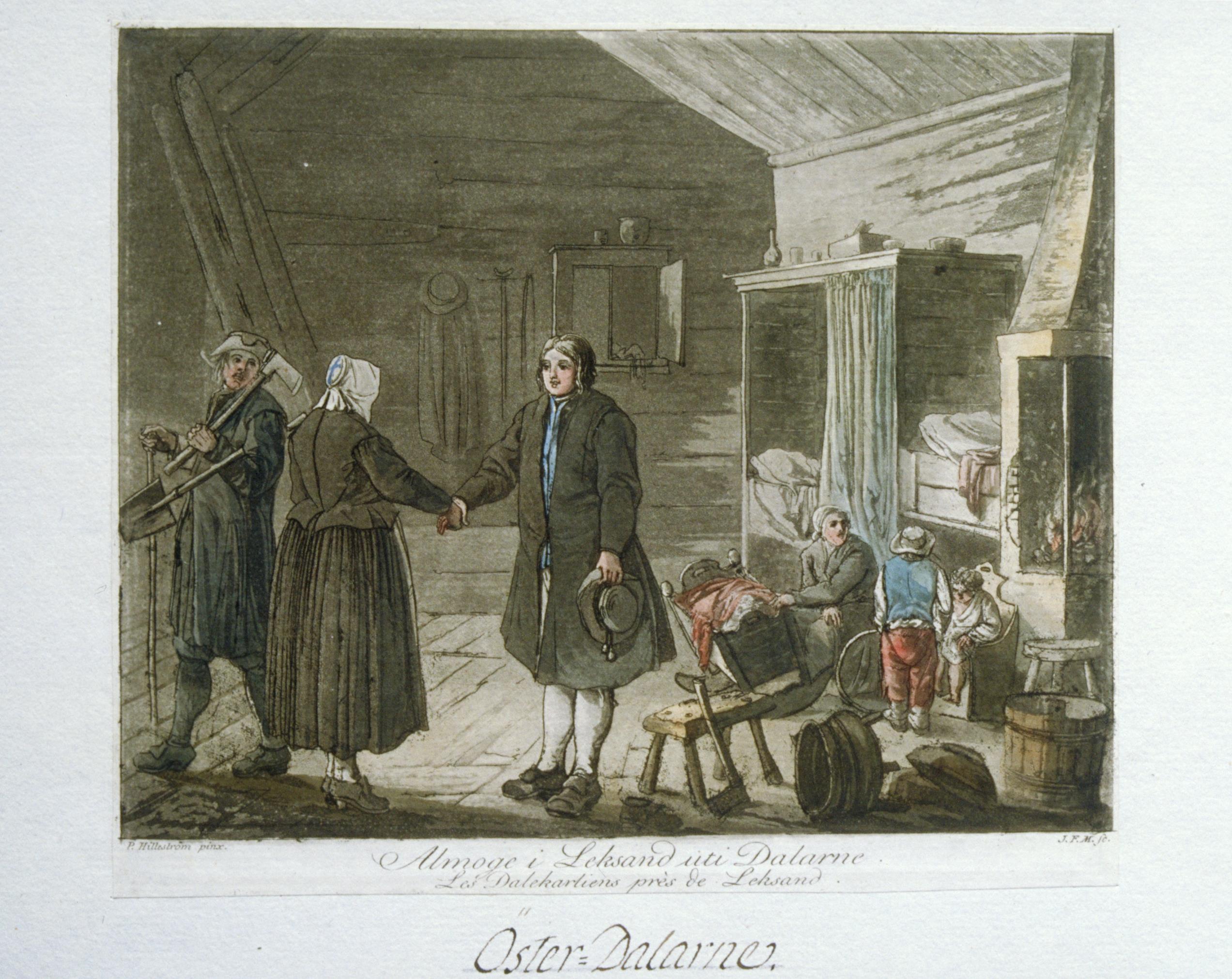 Allmoge i Leksand. Akvatint över konturetsning av Johan Fredrik Martin efter Pehr Hilleström d.ä. Ca 1800.
