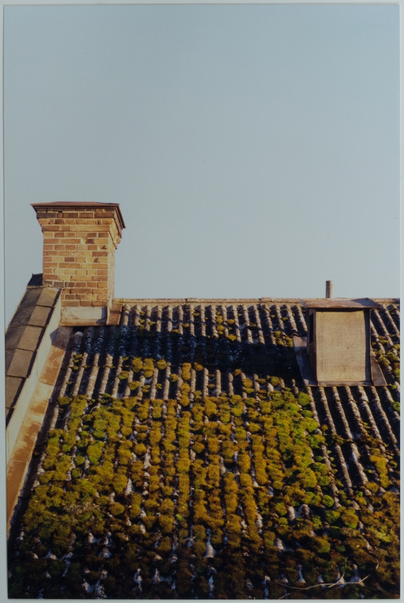 Maskinverkstaden inför restaurering, del av norra takfallet med kraftig mosstillväxt på asbestcementskivor