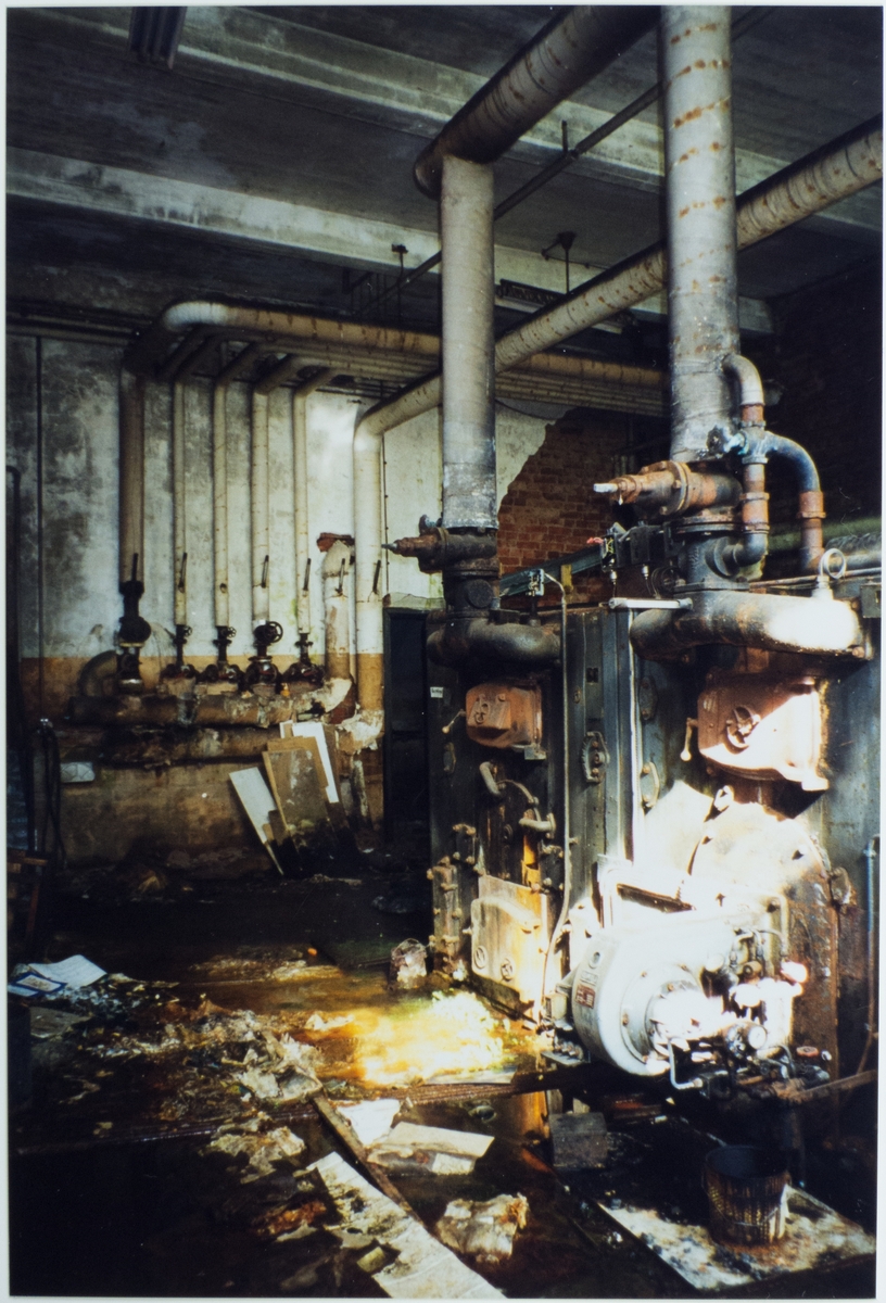 Maskinverkstaden: dokumentation inför utvändig restaurering. Pannrummet med fuktskador