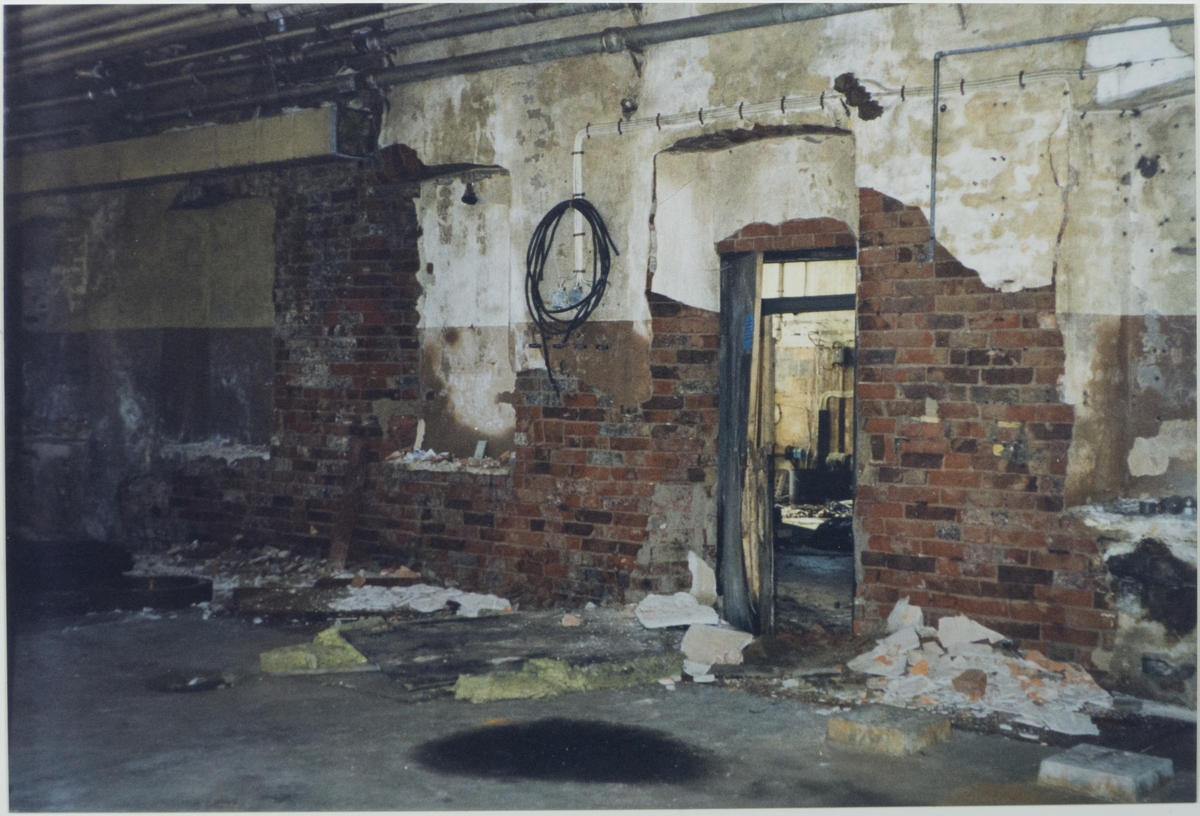 Maskinverkstaden: dokumentation inför utvändig restaurering. Vid dörren från verkstadshallen rill pannrummet