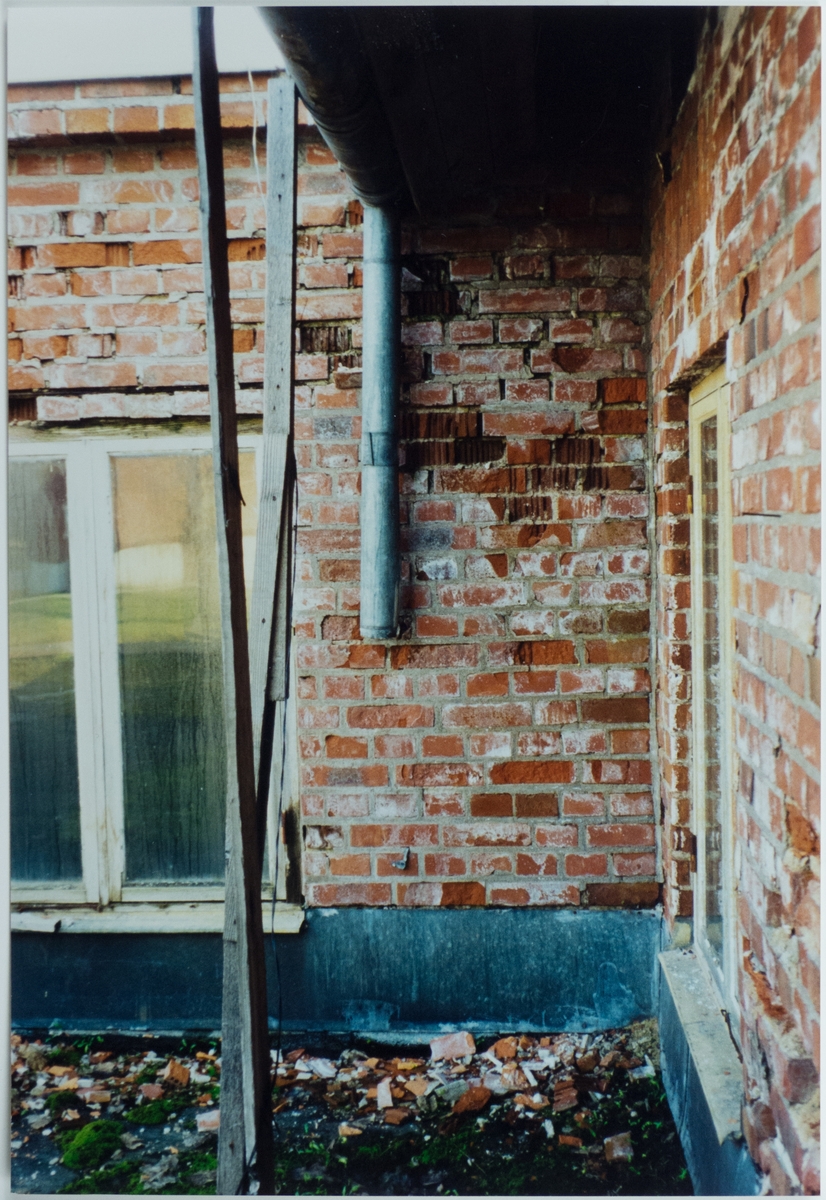 Dokumentation av Maskinverkstads exteriör. Skadad tegelmur.