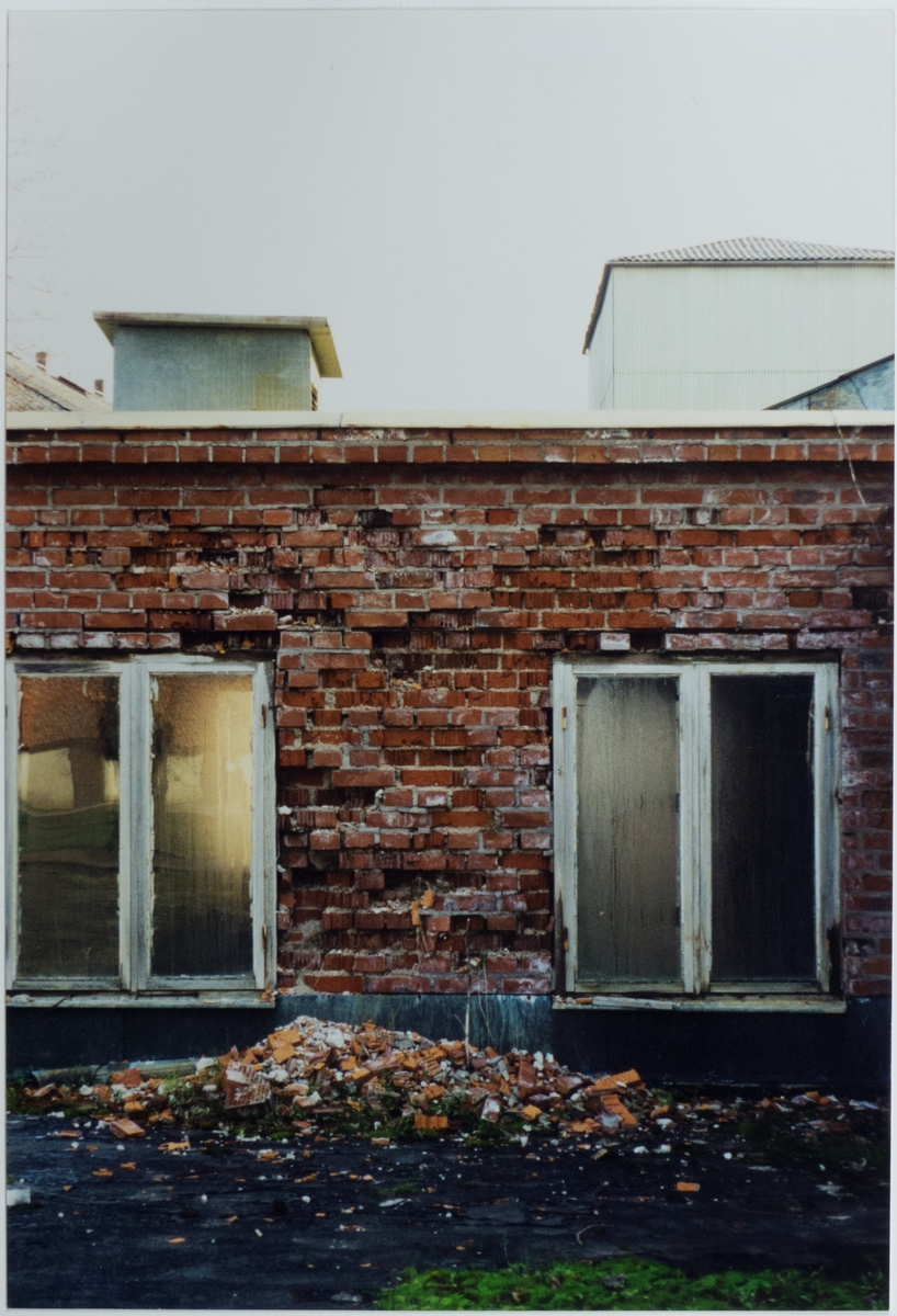 Dokumentation av Maskinverkstads exteriör. Grovt skadad tegelmur och fönster.