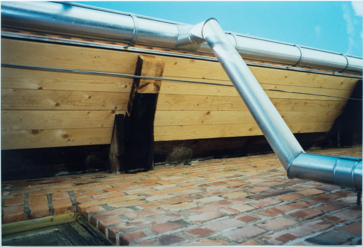 Maskinverkstad, takfot av nytt trä, ny takränna.