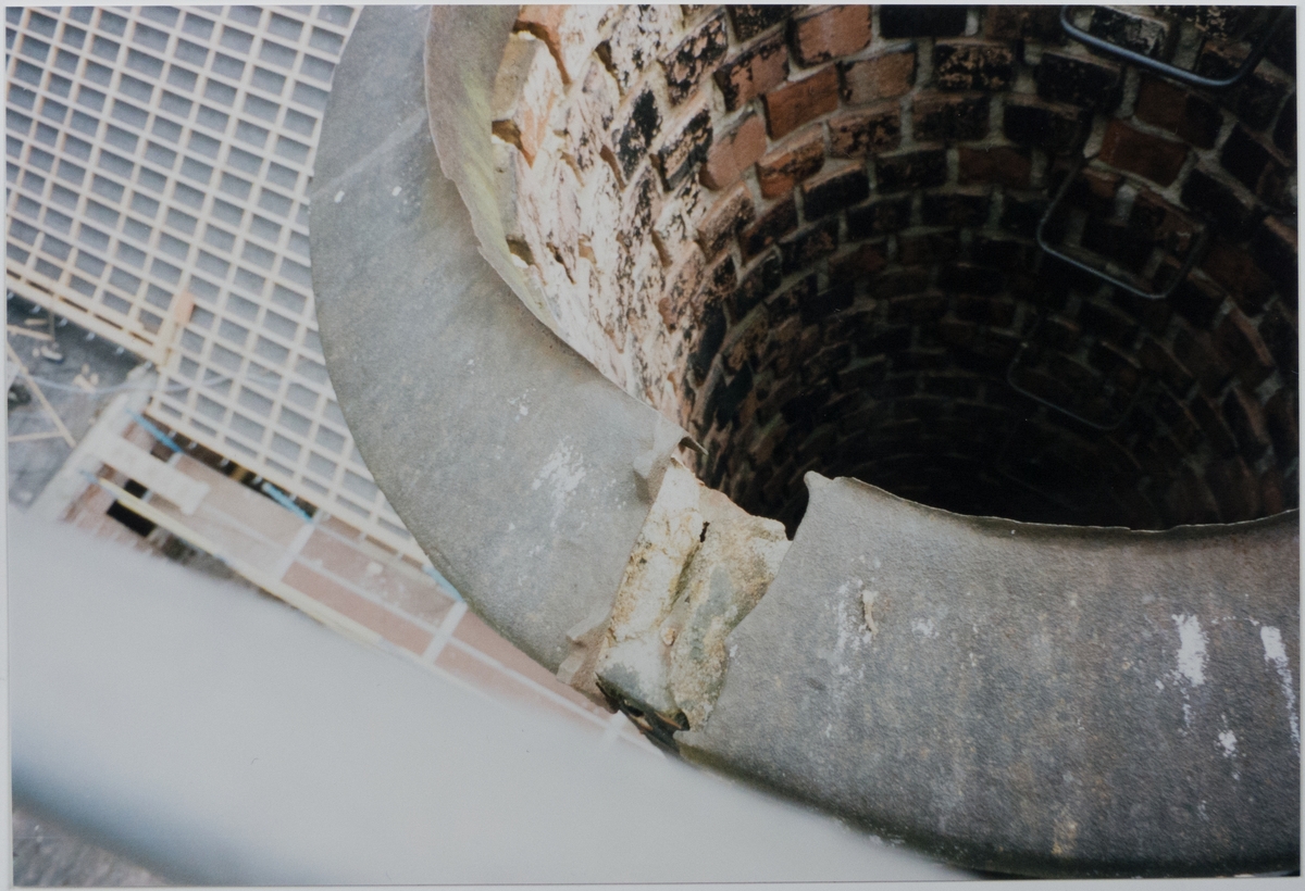 Titel: Mekaniska verkstaden, exteriör restaurering, inspektion av pannrumsskorsten: radialtegel, krans (tredelad) i gjutjärn, sprucken, murverket sprucket ca 8 skift, översta spännbandet i järn borta, åskledaren - hållarröret avrostat, övre fläns har stora skador, invändig och utvändig stege av bygeljärn, inmurad