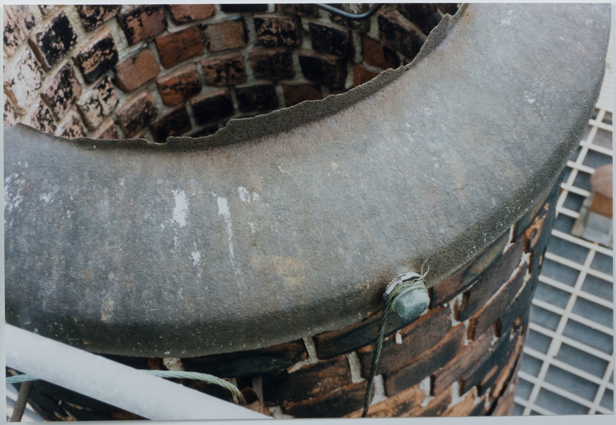 Mekaniska verkstaden, exteriör restaurering, inspektion av pannrumsskorsten: radialtegel, krans (tredelad) i gjutjärn, sprucken, murverket sprucket ca 8 skift, översta spännbandet i järn borta, åskledaren - hållarröret avrostat, övre fläns har stora skador, invändig och utvändig stege av bygeljärn, inmurad