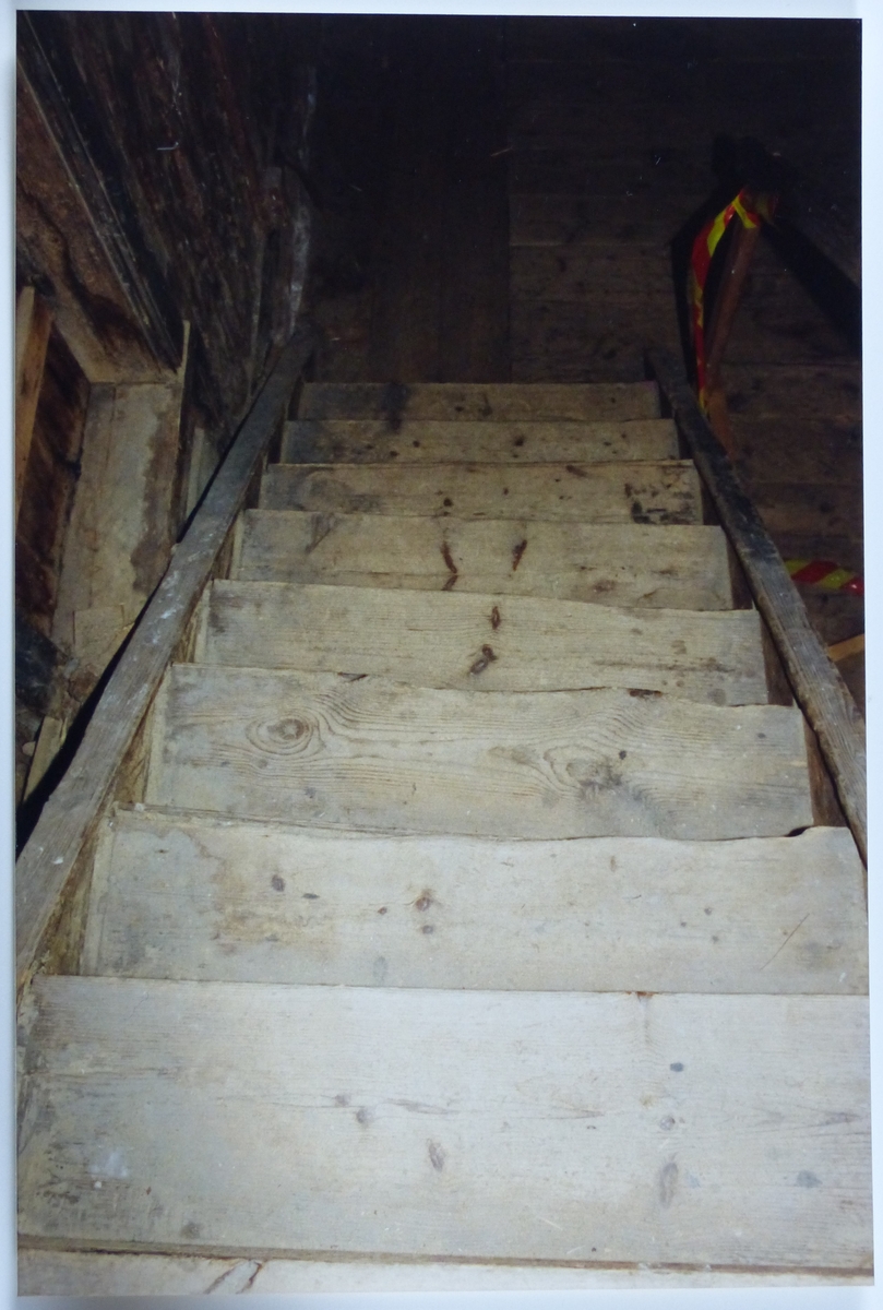 Träsliperiet före renovering. Trappa mellan vind och utställning i södra hörnet.