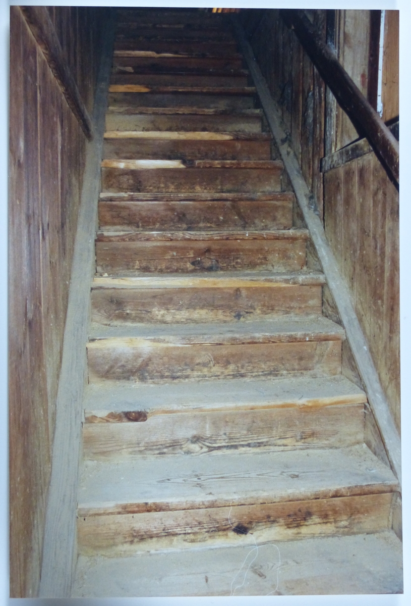 Träsliperiet före renovering. Trappa mellan vind och utställning i södra hörnet.