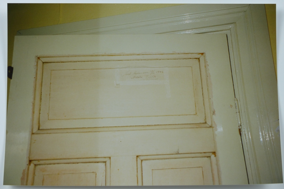 Dörr till ritsalen med inskription: Karl Andersson 29/12 1942 Billebo Forsvik, Brukskontoret plan 1.