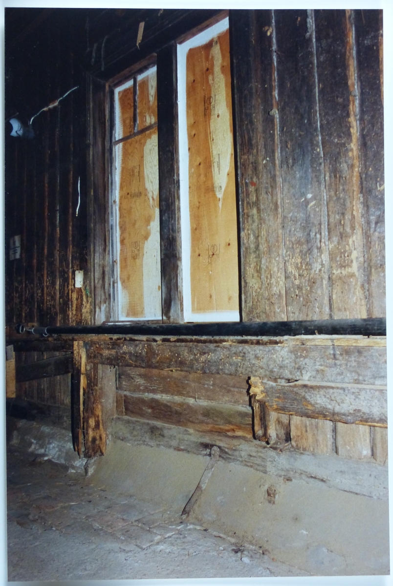 Träsliperiet före renovering. Vid södra brandporten, taket.
