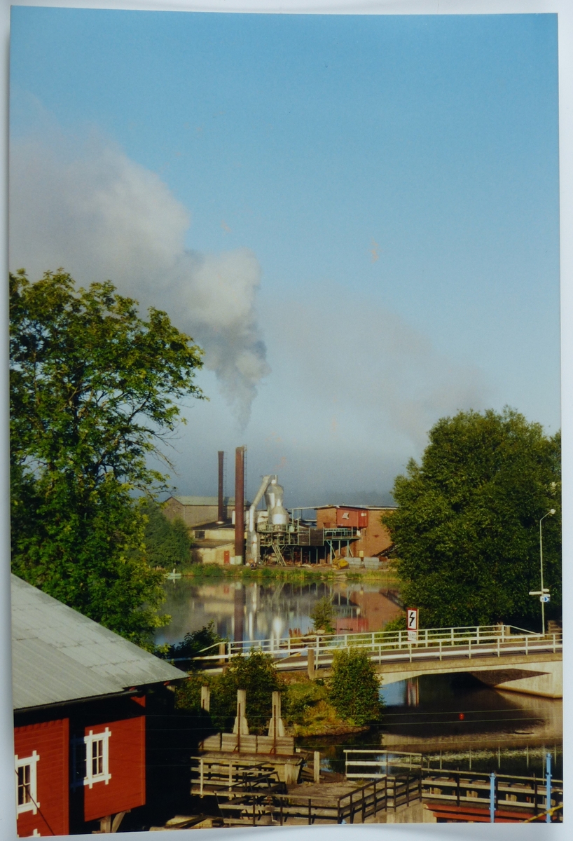 Träsliperiet skymtar i förgrunden, sågverket i bakgrunden