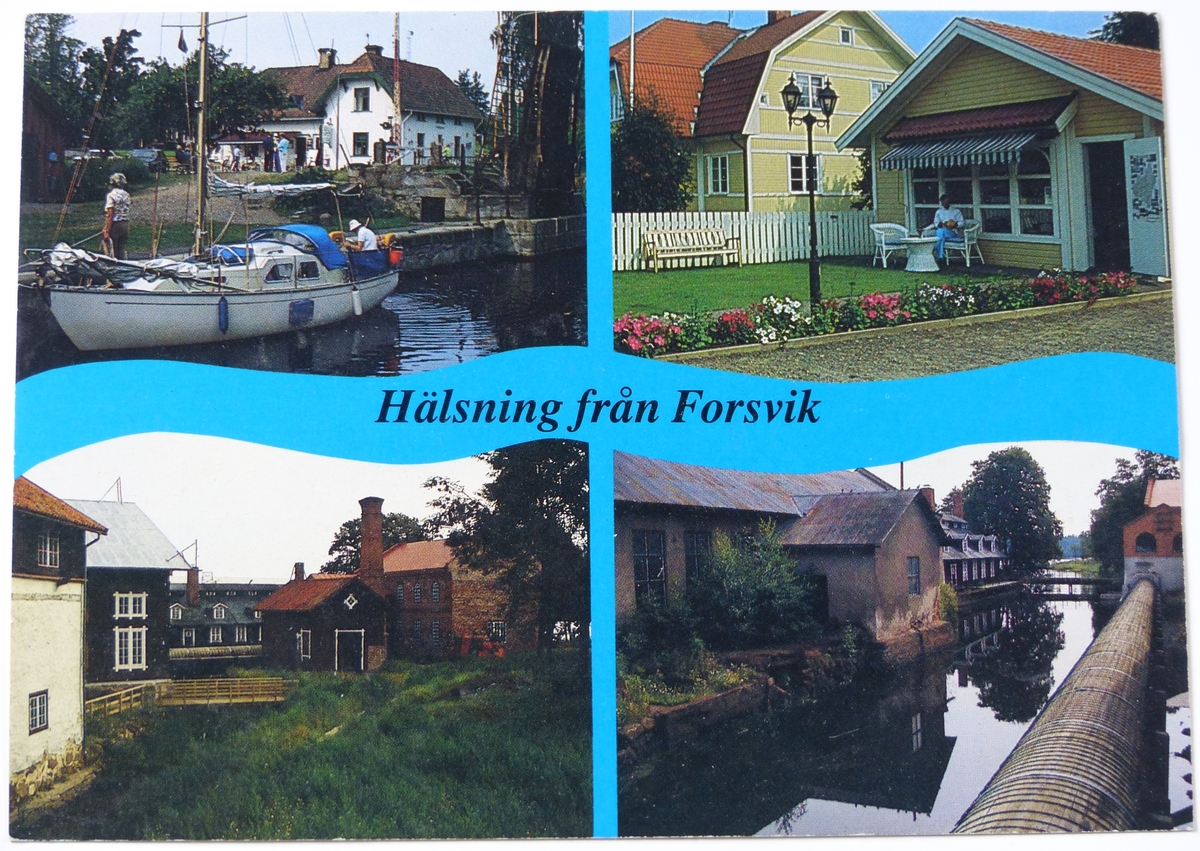 Titel: Vykort: Slusskaféet. Forsviks Hemslöjd. Gamla bruksanläggningen, Kvarnen, Träsliperiet och Sveriges enda bevarade kalorifer. Strömmen, den gamla smedjan och gjuteriet.