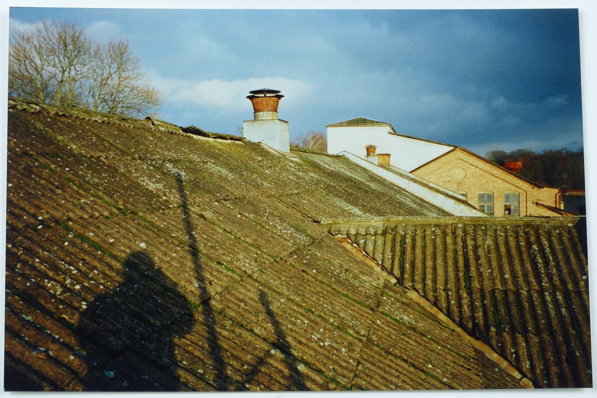 Takanslutning mellan Mekaniska verkstan och Maskinverkstad, eternit och sinuskorrugerad med grafitlinoljefärg ommålat plåttak