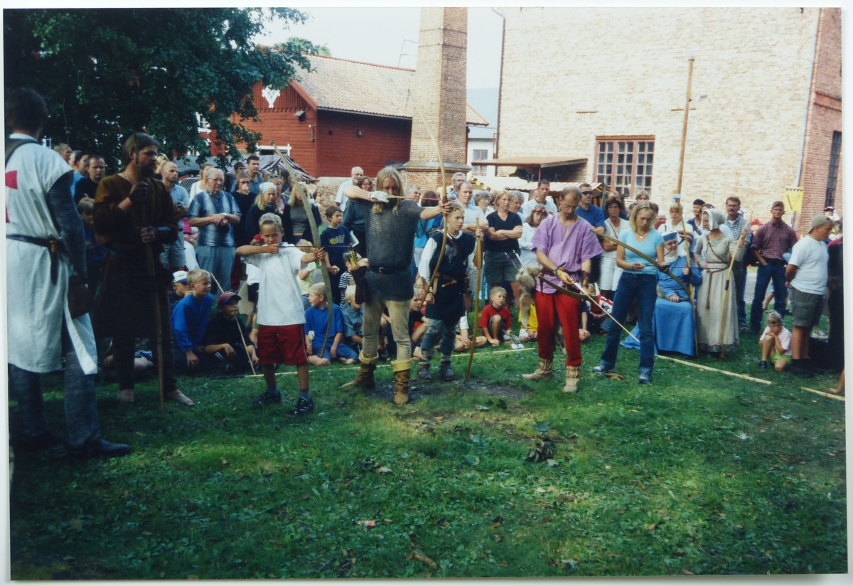 Titel: Västgöta lekar på Forsviks bruk. Medeltida tävlingar 25 augusti 2001. Tävling i bågskytte
